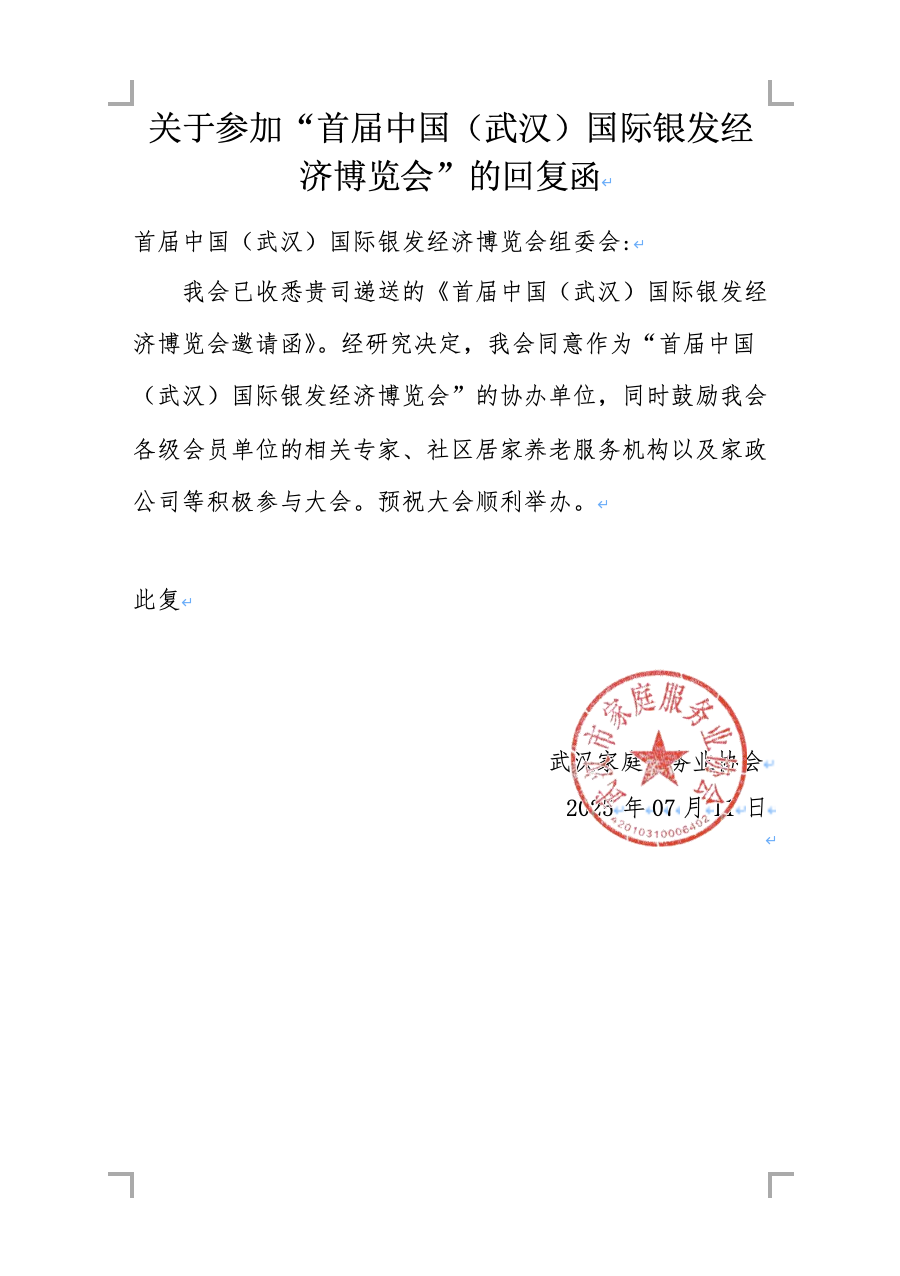 近日,中国(武汉)国际银发经济博览会(WISE武汉银发展)收到来自武汉市家庭服务业协会、武汉市家庭服务业协会居家养老分会的回函!协会表示,同意成为首届WISE武汉银发展的协办单位,并结合自身在养老服务领域的资源优势,鼓励单位的相关专家、养老机构和养老企业积极参与博览会,促进资源要素高效流动,推动养老产业融合共进,协同发展。
