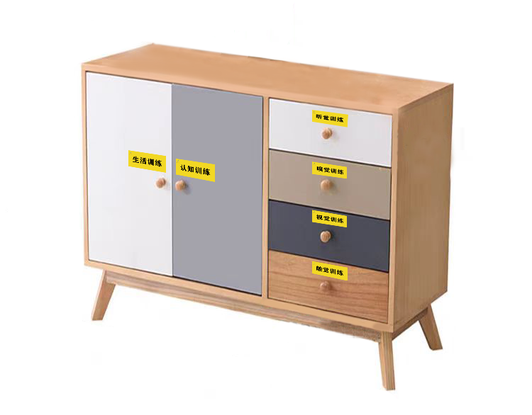 柜中包含视觉、触觉、嗅觉、日常训练物品等12-14套训练产品及训练手册。用于长者感官刺激训练及日常生活能力训练。