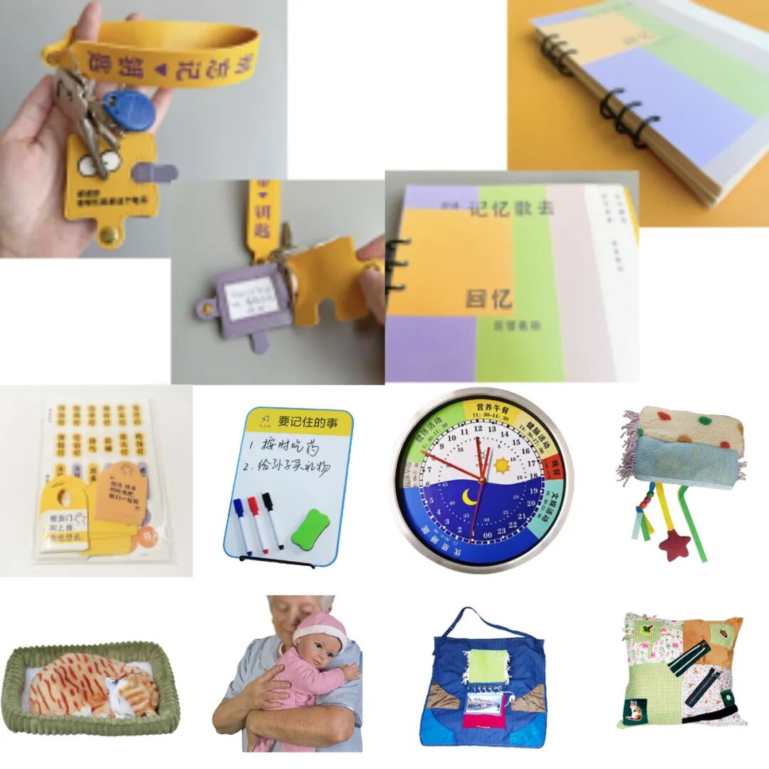 在家庭化生活场景中、配套适合高龄长者及认知症中、重度长者的个人抚慰及陪伴用品。包括娃娃疗法套装、宠物疗愈套装、多功能触觉及记忆毯、触觉多感官手筒、互动感官靠垫、记忆提醒板、定制训练时钟、走失求助钥匙环、照护记忆手账、家庭标识套装等10件/套个人、家庭认知产品。