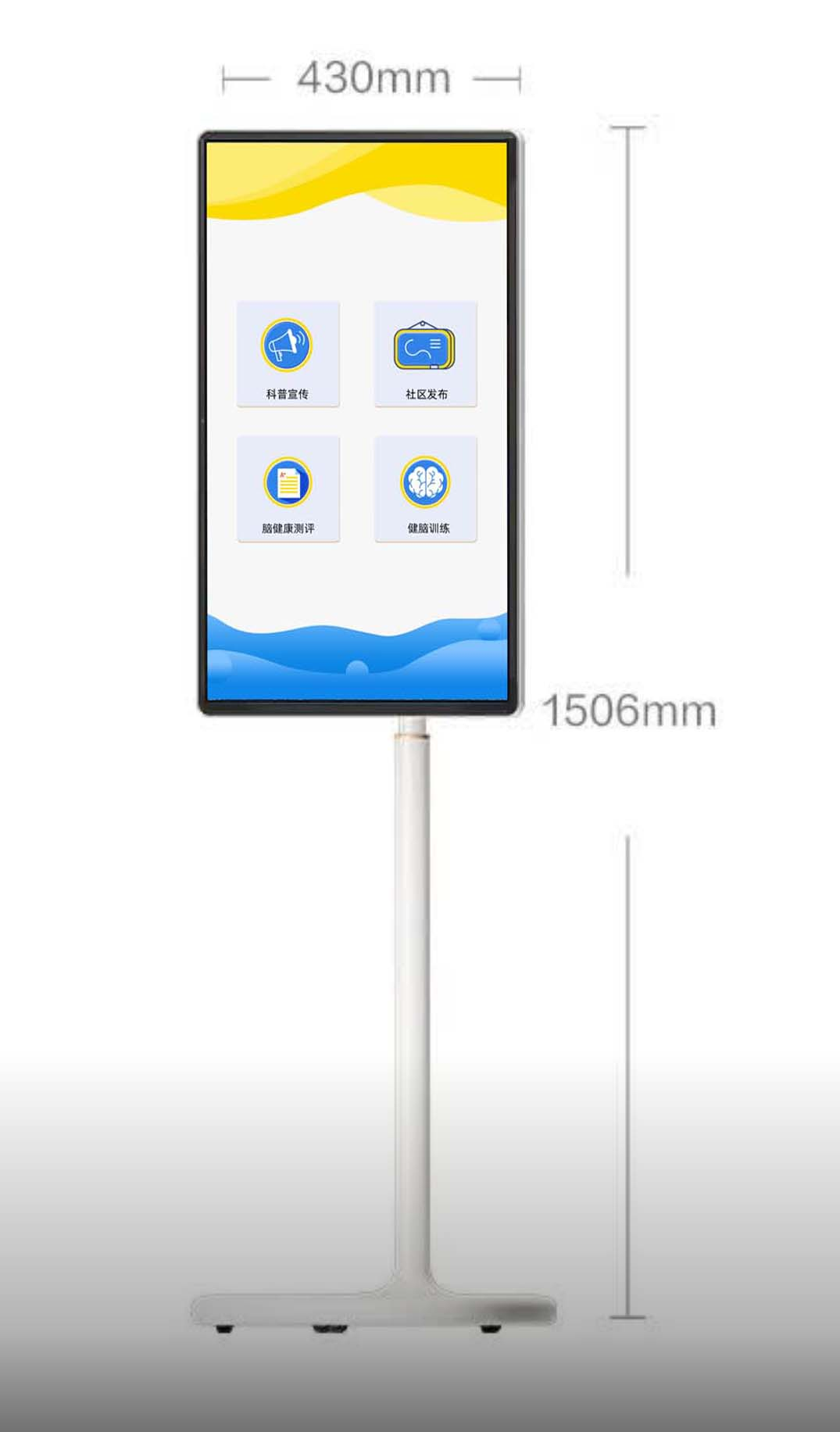 宣传/筛查/评估方案/训练一体机,32寸触控屏、32寸触控屏一体机,内置宣传科普、基础数据录入、脑健康筛查、认知能力评估、认知功能训练及游戏训练功能模块,内置打印模块,可与移端终端一起实现强大数据功能。