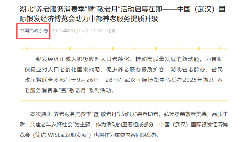 近日,中国(武汉)国际银发经济博览会(WISE武汉银发展)获得《中国民政》杂志的专题报道。作为中部地区覆盖银发经济全产业链的专业盛会,展会亮点备受瞩目。以下为《中国民政》杂志报道全文。