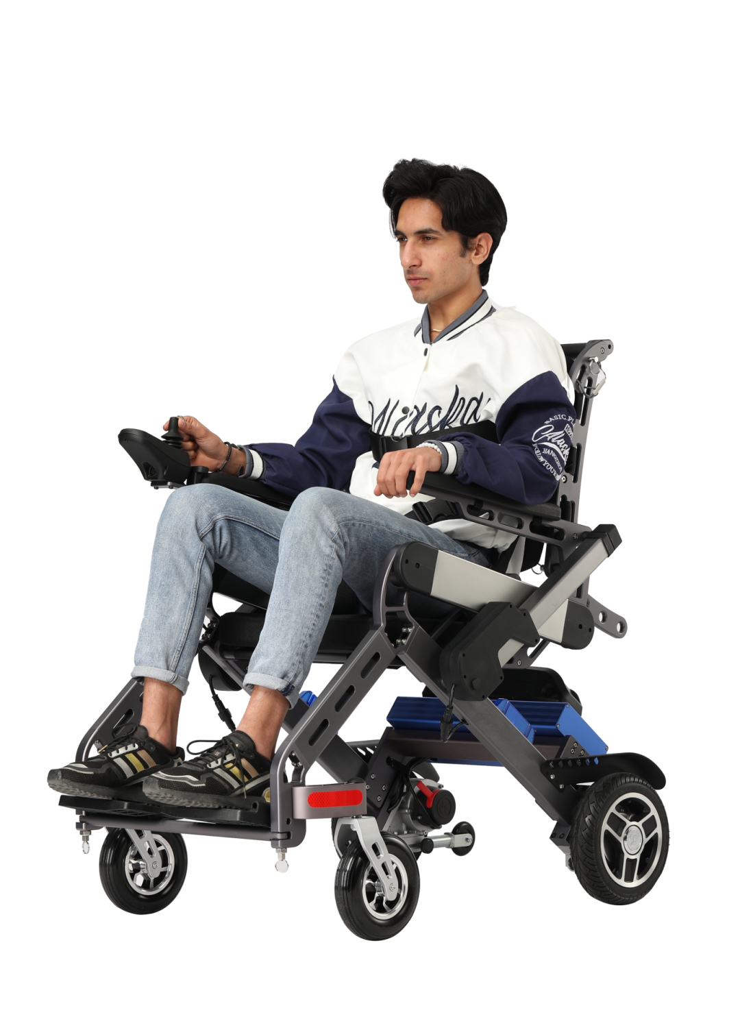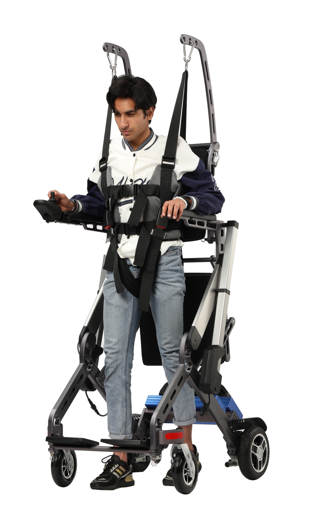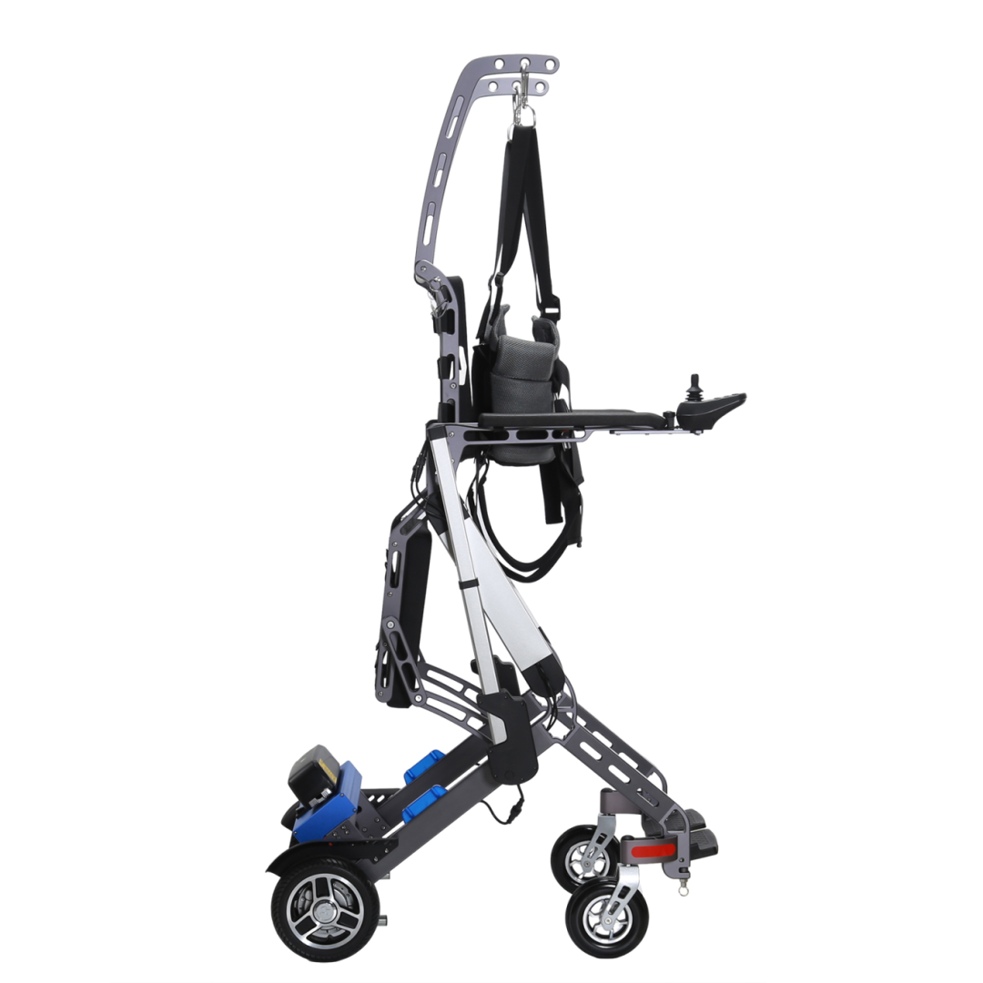 设备为人体工学设计,通过升降按键操作即可从轮椅坐姿状态变成助行站姿状态。减少或避免长期卧床和坐轮椅,缓解由于久坐产生的臀部肌肉酸痛及皮肤易生褥疮等问题。使用者进行行走训练时,佩戴好安全带,利用其升降功能,或独立进行主动或被动减重步态训练;也可借助此设备扶助老年安全行走,预防或减少发生摔倒的风险。起坐自由,方向杆操控方向;一键转换轮椅模式或助行模式。智能控制器按键操控前进后退及行驶速度;按键可调整行驶速度及档位;铝合金车架,结实轻便;前轮万向轮设计,灵活转向;高品质无刷电机;电磁刹车系统,停止按键操作后自动刹停。设备为双模式:步态行走训练模式,电动/手推轮椅模式;双姿态智能转换。