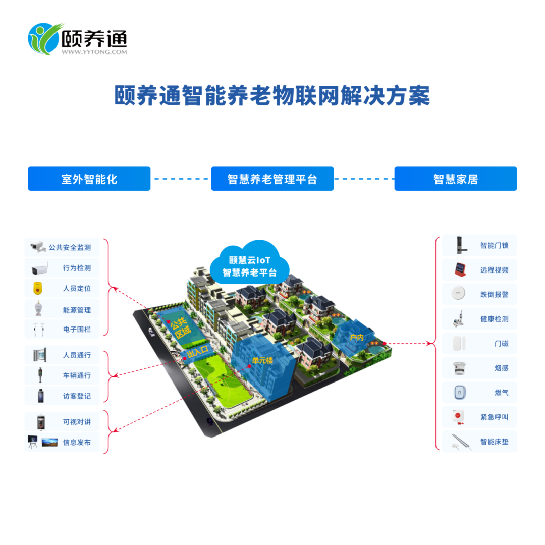 颐养通提供一整套面向养老行业的物联网平台,整合了全行业1000多种智能养老设备,应用于各类养老业态,实现智能照护、健康监测、安全监护、紧急呼叫等各类智慧养老场景。
