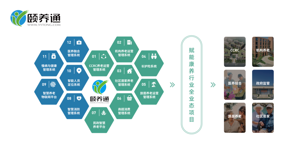 通过颐养通系列化软件产品的灵活组合,可赋能康养行业全业态项目的数字化建设需求。