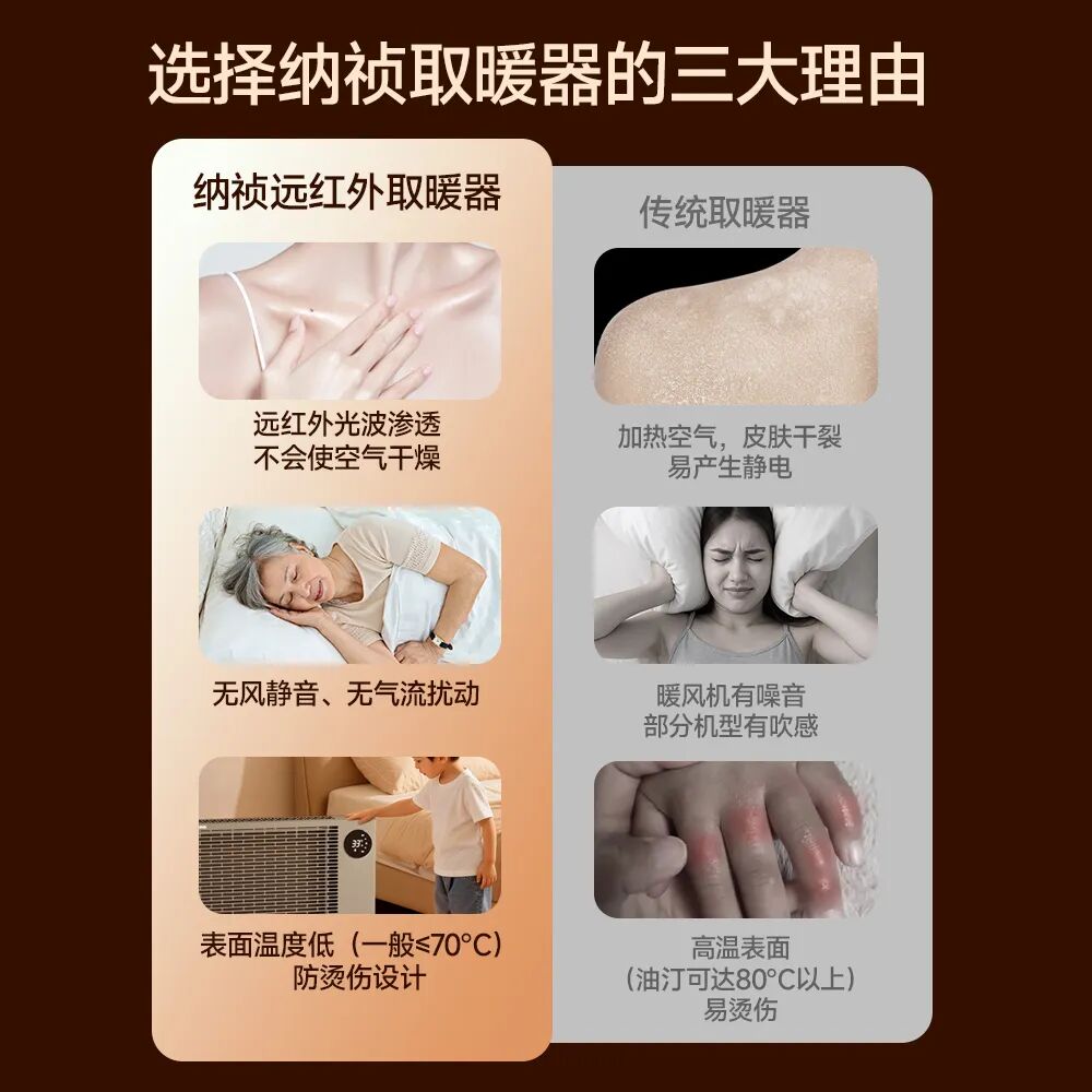 健康采暖:发射 4~16um 远红外线,热能深入渗透,温暖同频共振,仿若煦日怀抱。 -