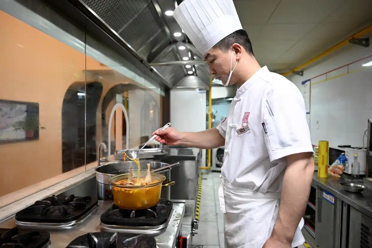 5月7日,在安徽省亳州市一家药膳餐厅,药膳制作师在制作药膳。新华社记者黄博涵 摄 拜耳医药保健有限公司亚太跨境电商及中国境内电商副总裁万妍婧介绍,年轻人生活忙碌,“零食化”“轻量化”成为年轻人选择健康养生品的重要方向。对此,安琪纽特、汤臣倍健等品牌都在加快布局,功能性食品品牌“美那有”推出的富铁软糖、叶黄素酯软糖等产品,受到年轻人普遍欢迎。
